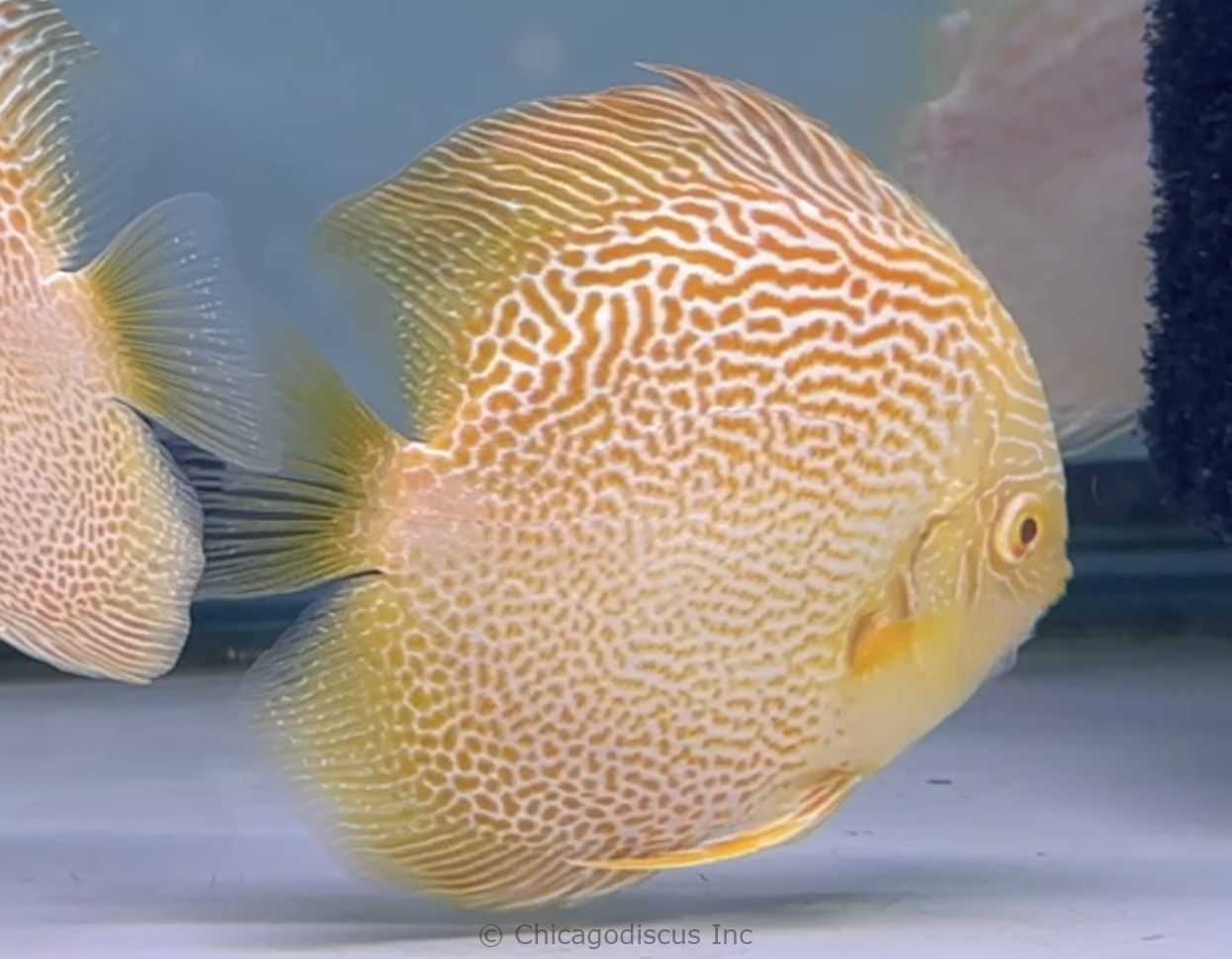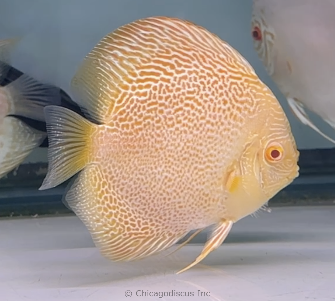 Our Albino Golden Leopard Snakeskin (GLSS) from Robert Lim are back in stock again. These are a nice medium size, 4.5-5.0″. Beautiful golden yellow with fine snakeskin spots completely covering the discus. An exquisite pattern! And remember, albinos will never discolor. They will stay as clean and bright as the day you introduced them into your tank. Look at the pictures to see the details. The video is from the April 2026 stock. Albino White Butterflys are in the same tank. Pictures of the Albino GLSS will be posted later this week. Note: these tend to sell out quickly, there is only one left